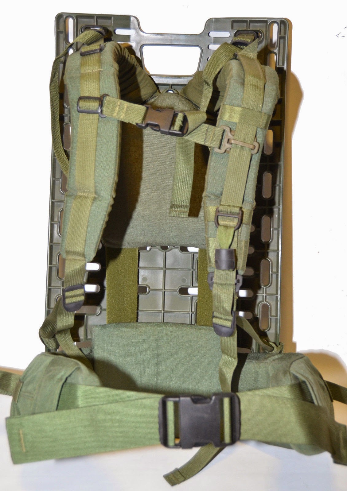 These were manufactured in 1998-2001 to carry items for the ERYX system. It is essentially a very well made rucksack frame that doubles as a pack board / cargo carrier. You can mount a rucksack bag that you have, or use it the way it is and strap your heavy cargo to it. It is adjustable for any body size as the shoulder harness and hip belt system can slide up or down in channels in the frame. They lock into place by 2 screws and a sliding bracket.