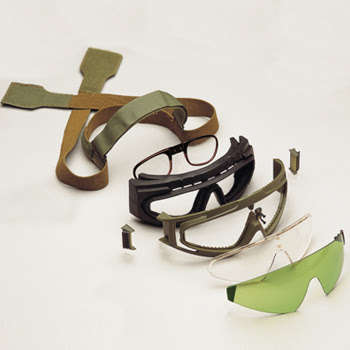 The system consists of a goggle frame with a clear ballistic lens and a wide range of easily installed outsert lenses. A lightweight frame for corrective lenses can readily be inserted, eliminating the problem of fitting military goggles over spectacles.