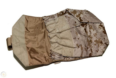The Gas Mask Carrier mounts horizontally, it also is lined with pack cloth and it has an elastic opening with a flap.